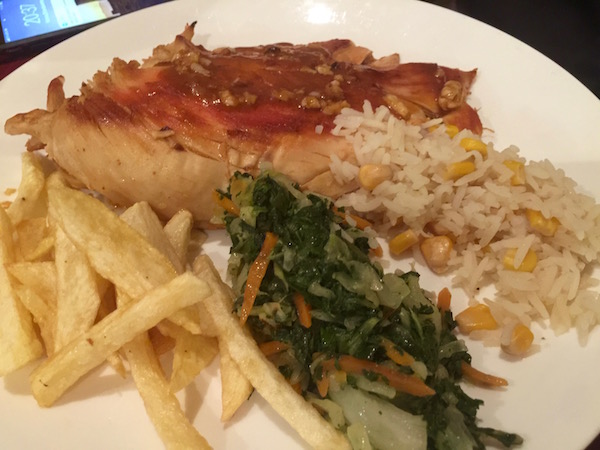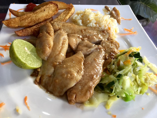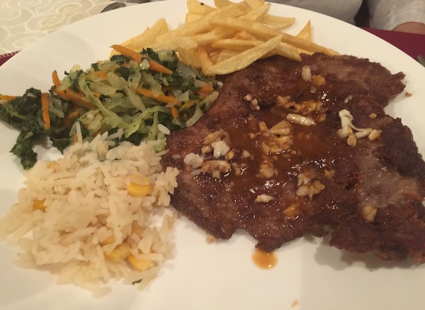Terminada la visita nos fuimos almorzar al Restaurante Café Olive Bahir Dar donde pedimos una sopa de lentejas, para el otro una ensalada de verduras cocidas, dos platos de pescado (tilapia) una coca cola, una botella de agua mineral. Pagamos un total de 302 birrs (9,51 € aprox.) Situado en la ciudad de Bahir Dar.