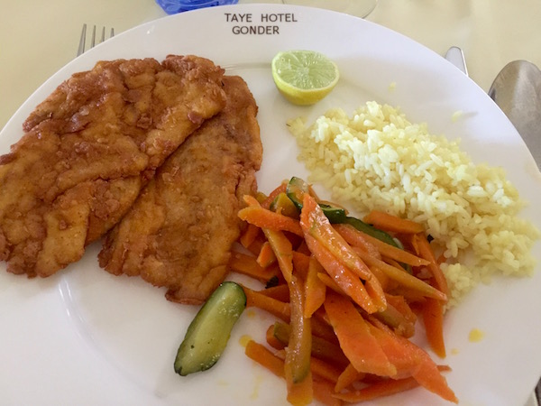 Fuimos hasta el Hotel Taye Belay Gondar alojamiento de cuatro estrellas, habitaciones sencillas, con baños pequeños. En la habitación te obsequian con dos botellas pequeñas de agua mineral. Ofrece wifi gratis en las zonas comunes, el propio hotel tiene un cajero automático, situado en el centro de la ciudad. Pagamos por alojamiento de una noche+desayuno un total de 72 €. La dirección es Kebele 3. Hicimos el check-in, dejamos el equipaje, decidimos almorzar en el propio restaurante del hotel. Donde pedimos una sopa de lentejas, un plato de pescado para cada uno, de postre, una pieza de fruta, un plátano, de bebida dos botellas de agua mineral. Pagamos un total de 447,99 birrs (14,07 € aproximadamente). Acabada la comida nos fuimos a andorrear por la ciudad.