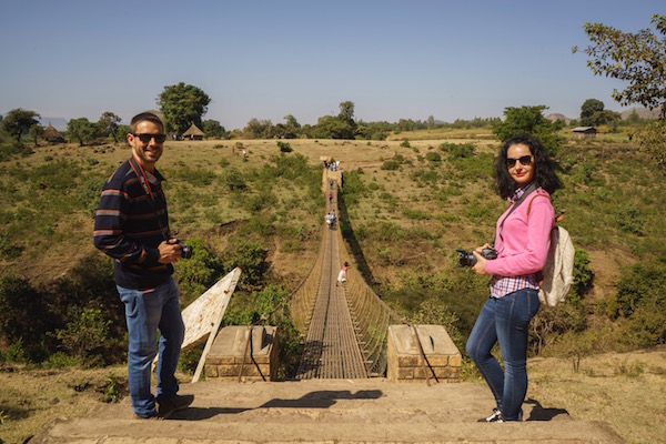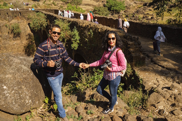 La furgoneta se quedó estacionada en el arcén de la carretera, a las afueras del pueblo Tissisat, donde está la taquilla del parque nacional, allí se adquieren los tickets de entrada a las Cataratas del Nilo Azul, desde este punto hay un camino donde comenzamos un descenso a las Cataratas del Nilo Azul, una caminata por un sendero, llamémoslo así, verdaderamente, !Íbamos a trocha monte!, caminamos, caminamos, aún no la veíamos y ni siquiera la escuchábamos. Eso sí, nos encontramos vendedores y niños que nos acosaban intentado de vendernos recuerdos o incluso nos pedían pertenecías que llevamos puestas. Pasamos por el puente de los portugueses Tis Isat, de piedra con ocho ojos, fue construido en 1626 por orden del emperador Sunseyos, convirtiéndose en el primer puente de piedra edificado en Etiopía. ¡Al fin!, nuestros oídos podían escuchar el estruendo del agua de la cascada ¡Nos estábamos acercando a ella! Ahora sí la teníamos de frente, pudimos ver los cuatro canales que forman las cataratas. Permanecimos en la zona durante unos