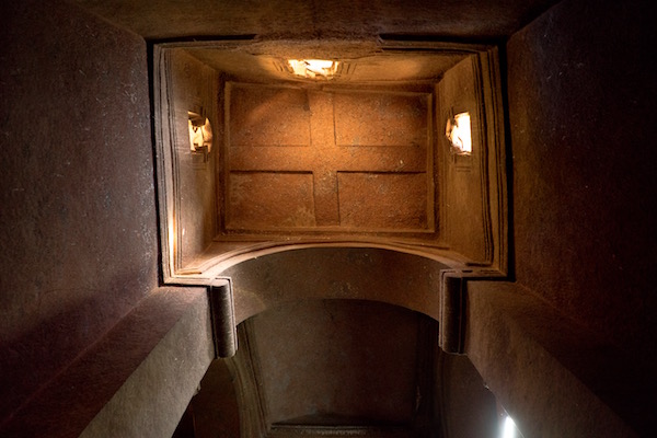 Comenzamos el recorrido en la Bet Medhane Alem (casa de El Salvador del Mundo) la más alta de todas las iglesias de Lalibela, con una altura de más de 11,5 metros, es la iglesia excavada en la roca más grande del mundo con una superficie de 800 m², localizada en el grupo norte. Se cree que para construirla tuvo que ser necesario retirar nada más y nada menos que 15.000 metros de rocas. Su espacio interior es de 10.000 m3, consta de una sola nave con bóveda de cañón y cuatro pasillos, 38 columnas que sostienen el tejado a dos aguas. No tiene pinturas y muchos piensan que es una copia en roca de la catedral de Santa María de Sion en Aksum. Si tienes la oportunidad de visitarla en domingo podrás ver a los fieles, llegar hasta ella para ser bendecidos o curados por la cruz de Lalibela, es una cruz de oro que pesa7 kg. Bueno, nosotros tuvimos la oportunidad de poder verla, previa propina al sacerdote de 100 birrs (3,15 € aprox.) También vimos las tres tumbas vacías que hay en una esquina del templo, nos contaron que fueron preparadas simbólicamente para Abraham, Jacob e Isaac. Para evitar el deterioro del templo se construyó una estructura exterior en 2008 por la Unesco. Aunque para nuestro gustó le ha quitado y restado belleza. Es cierto que todas las iglesias excepto la de Bet Giyorgis, poseen esa cubierta.