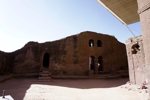Bet Abba Libanos, aunque desde fuera nos daba la impresión de que es grande, una vez dentro pudimos comprobar que su interior es pequeño. Está iglesia está excavada en roca, se caracteriza por ser la única que el techo y el suelo permanecen unidos en la misma roca. Hay una leyenda que cuenta que fue edificada en una sola noche por la esposa de Lalibela, teniendo la ayuda de una cohorte (tropa) de ellos.