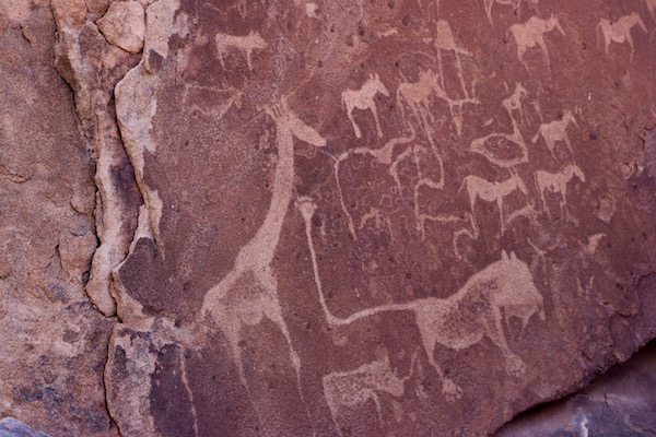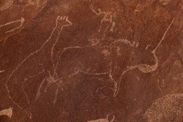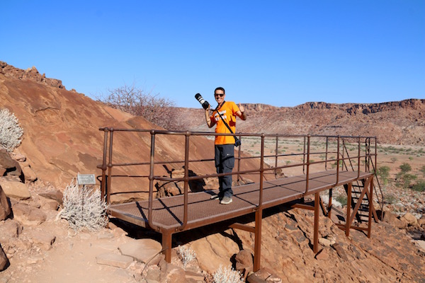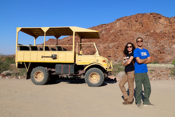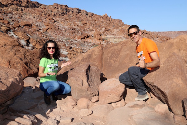Nos acompañó en la visita una guía del parque, iniciamos una caminata a pie para llegar hasta ellos, hay que tener cuidado, el suelo es muy irregular, hay muchos agujeros, piedras, etc. La guía nos hizo una pequeña introducción del lugar. El nombre fue puesto por la familia de afrikáner que se asentó en el lugar, antes era llamado Ui-aes “manantial saltarín” por los pastores nómadas khoi-khoi. Entre las rocas de la colina existía un manantial por donde corría agua unas dos o tres veces cada año. El sitio es muy árido, hay una gama de diferentes colores ocres. Subimos por unas pasarelas metálicas con barandilla que ascienden por la ladera rocosa de la colina, donde nos volvieron a dar otra explicación de los grabados rupestres de la zona. Hay más de 2.000 figuras con más de 6000 años, estas tallas y pinturas sobre las rocas fueron hechas por las tribus bosquimanas a lo largo de miles de años. Era la forma de enseñar a los jóvenes de la tribu sus formas de caza y dejarlo como indicación para la siguiente llegada de nómadas. Muchas de ellas se encuentran hoy en día en muy buen estado de conservación, otras no, debido al paso de los años e incluso por actos vandálicos. En estos grabados o petroglifos se pueden ver animales como: rinocerontes, elefantes, jirafas, avestruces, etc. Es donde se encuentra la mayor colección de grabados de piedra o petroglifos de toda África. Actualmente, están muy vigilados y hay un programa de restauración. Fue declarado Patrimonio de la Humanidad por la Unesco en 2007. ¡Recuerda!, llevar agua o algún refresco, en el lugar hace un calor abrasador. Calzado cerrado apropiado para hacer trekking. La entrada tiene un coste de 60 dólares namibios por persona (3,71 € aproximadamente) con visita guiada y por el estacionamiento del vehículo hay que pagar una tasa de 20 dólares namibios (1,24 € aprox.)