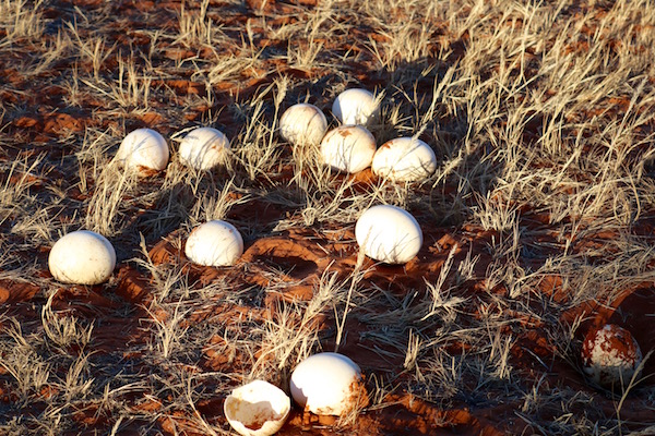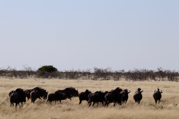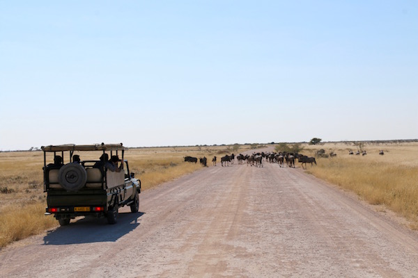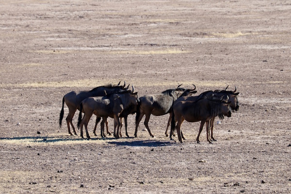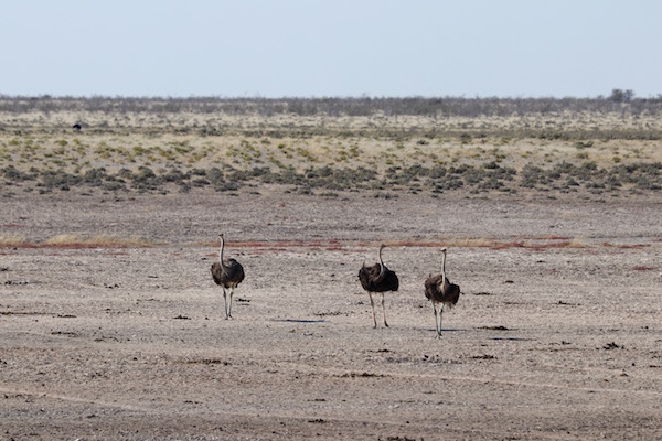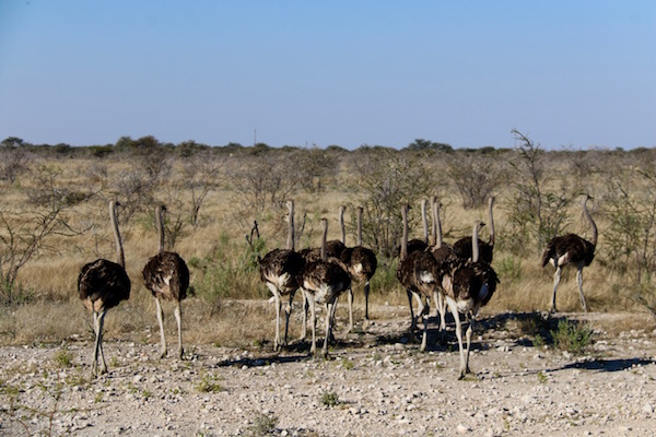 Al día siguiente nos levantamos, hacía un frío horrible, el agua del grifo salía congelada, nuevamente con el polar puesto fuimos a desayunar, terminamos la comida, volvimos a salir de safari ¡Sorpresa!, el 4×4 estaba pinchado la rueda trasera, el chofer tuvo que cambiarla, una vez solucionado el problema, salimos, ese sería nuestro último safari por Namibia. Los primeros animales que se dejaron ver fueron una manada de ñus, unos pocos metros más adelante vimos un avestruz que iba a toda velocidad, unos metros más delante nos encontramos unos huevos de avestruz abandonados, pensamos que eran de avestruz, por el tamaño que tenían.