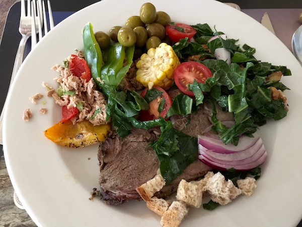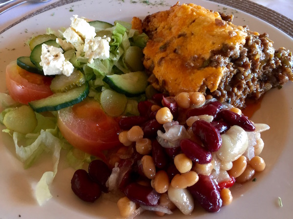 Regresamos al campamento para el almuerzo, esta vez nos tenían preparado una lasaña de carne de impalas, acompañado de verduras y judías. Nos tomamos un café y disfrutamos del lugar.