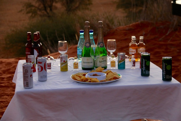 Por el camino vimos unas jirafas y unos oryx, hasta llegar a una zona donde nos ofrecieron un aperitivo, unos snacks, refrescos. Mientras tanto, nosotros no perdimos la oportunidad para tomarnos unas fotografías y disfrutar del lugar. Por último, como broche final pudimos contemplar un atardecer africano. Habíamos pasado una tarde genial, llegó el momento de regresar al lodge, para darnos una ducha y cenar.