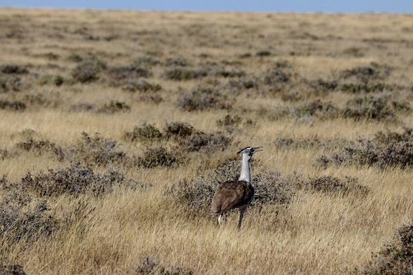 Recorrimos unos kilómetros y miramos hacia el suelo y nos sorprendió el ardeotis kori es una especie de ave voladora de plumaje gris, alas pardas, cresta negra y patas de color amarillento. Se alimenta de hierbas e insectos. Pesa más de 18 kg con 130 centímetros de longitud. Incuban de uno a dos huevos, el macho no participa en la incubación.