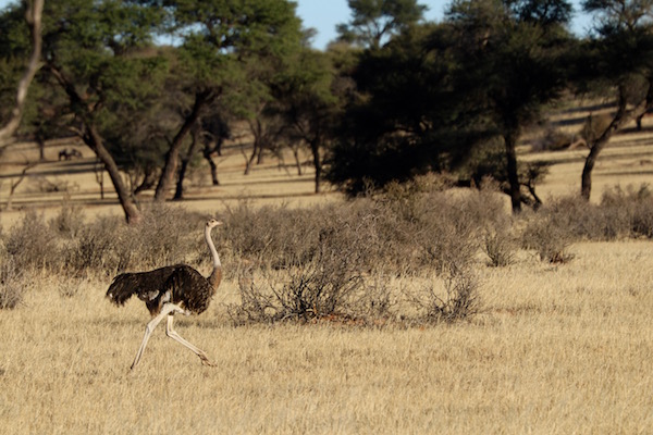 A lo lejos, al otro lado de la carretera venían avestruces, hacia nosotros, bueno, hacia nosotros no, iban en busca de la laguna de agua. El avestruz es un ave, siendo la más grande y pesada, no vuela, pero puede llegar alcanzar una velocidad de 90 km/h, en tramos hasta 30 minutos. Sus alas al abrirlas y agitarlas espantan a sus posibles depredadores. Los machos tienen las plumas de color negro, en cambio, las hembras son de color gris. Su cabeza es pequeña, los ojos son relativamente grandes, de 5 cm de diámetro, teniendo una vista increíble, el cuello es largo y sin plumas, este animal pesa unos 180 kg y mide unos 3 metros de altura. El avestruz se alimenta de hierba, fibra, artrópodos, pequeños animales e incluso de restos de carroña, no mastica al carecer de diente, ingiere los alimentos. Permanece en manadas de 5 a 50 individuos, viven entre 30 y 40 años. La incubación de un huevo dura entre 39 a 42 días, se turnan para el cuidado la hembra por el día y por la noche el macho. Un huevo de avestruz puede alcanzar los 25 cm de largo y pesar entre 1 a 2 kg. Los recién nacidos miden entre 25 a 20 cm y pesan 900 gramos. Lo gracioso es cuando quiere pasar desapercibida porque abajo su cabeza hasta el ras del suelo.