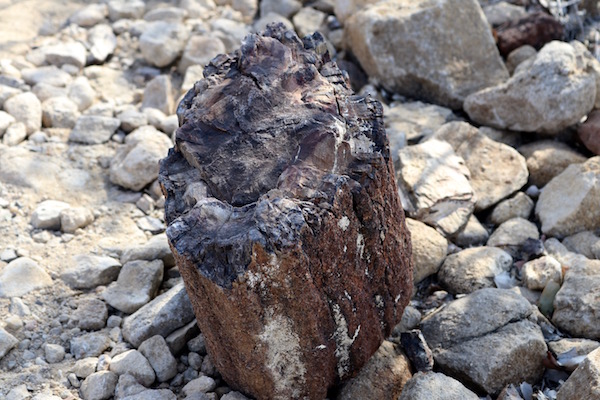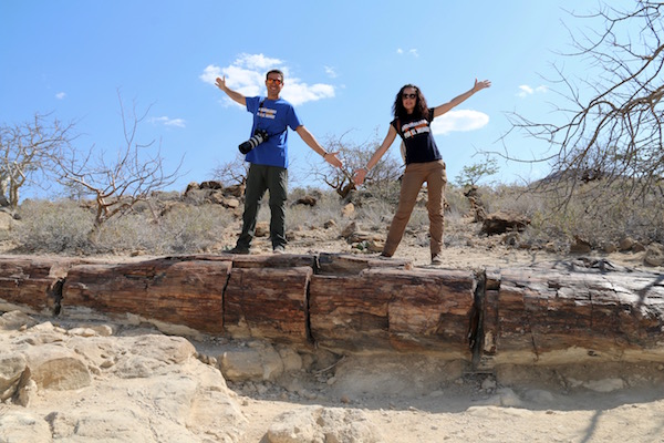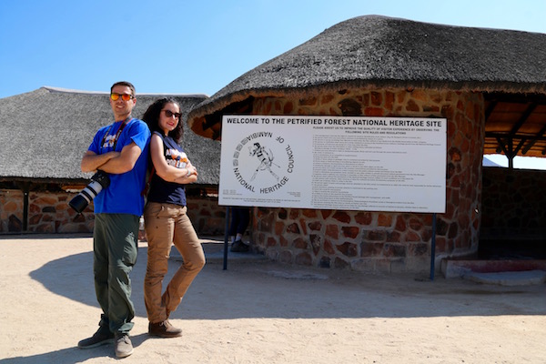 Retomamos de nuevo la carretera hasta llegar al Bosque Petrificado estos árboles crecieron en otras zonas y fueron arrastrados hace millones de años, hasta el lugar, debido a la crecida de un río, eran recubiertos de sedimentos y con el paso del tiempo fueron descubiertos por la erosión. El proceso de fosilización transcurre muy lentamente, petrificando las partes internas de los troncos de los árboles. Estos trozos de troncos están dispersos por el suelo, que se han convertido en piedra, no pienses que permanecen en pie. Tiene una antigüedad de más de 260 millones de años, vimos unos troncos petrificados con una longitud de 34 metros y 6 metros de diámetro. El lugar fue declarado Patrimonio Nacional el 1 de marzo de 1950. La entrada al parque tiene un coste 40 dólares namibios por persona (2,47 € aprox.) Abierto todos los días del año.