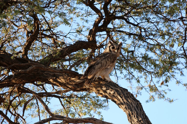 Nos encontramos en una rama de un árbol, un búho africanus es una ave de mediano tamaño, perteneciente a la familia strigidae. Son depredadores nocturnos, se alimentan de pequeñas aves y mamíferos, insectos y reptiles. Por el día se ocultan en las ramas de los árboles, formaciones rocosas, etc. Tiene unos 45 cm de medida y un peso entre 480 y 850 gramos. Su pluma es de color ocre pálido y sus ojos son amarillos. Anidan cada año, las hembras incuban de 2 a 4 huevos. Su esperanza de vida es de 10 años.