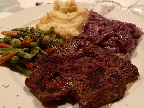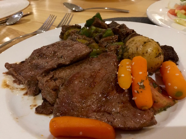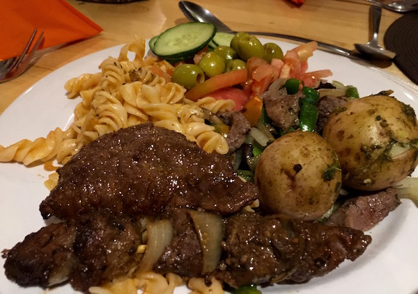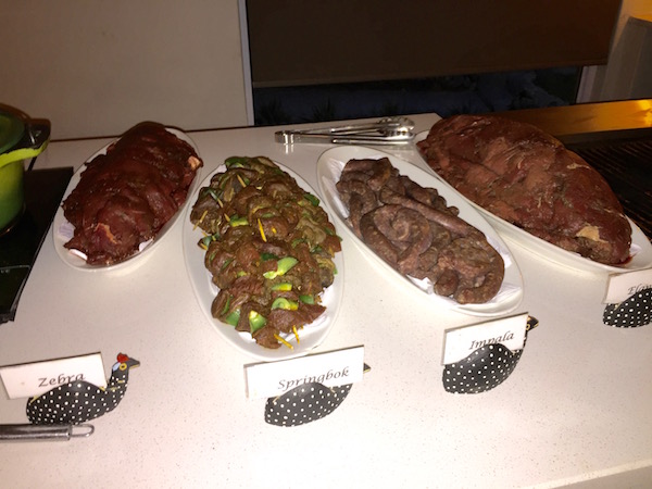 Tocaba hora de abandonar el parque y regresar al campamento. Llegamos al lodge, nos fuimos hasta la habitación para darnos una ducha, y conectarnos al wifi, a las 19:00 h fuimos hasta el comedor del campamento para cenar, la comida fue tipo buffet, donde había verduras, una gran variedad de diferentes carnes de caza como: impala, cebra, springbok y muy poco pescado, fruta y pasteles.