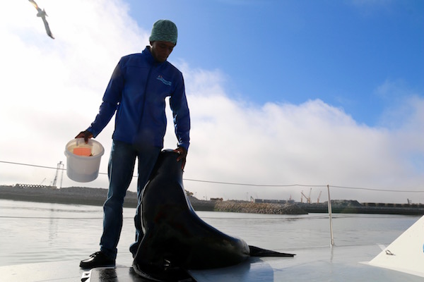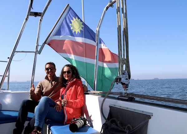 Nos despertamos con la melodía de Mozart, nuestros vecinos lo tenían como tono del despertador. No nos podíamos quedar dormidos y decidimos levantarnos, conectarnos a internet y hacer algunos trabajos con el ordenador. ¡Hasta nos vino bien! Bajamos a desayunar e hicimos el check-out, Helder nos llevó hasta la Bahía de Walvis, hay que estar 30 minutos antes del embarque, subimos al catamarán a las 9:00 h de la mañana. Hay diferentes compañías que cada día realizan esta travesía, nosotros lo hicimos con la compañía Catamarán Charters, escogimos el tour de Dolphins y Seal Cruise.