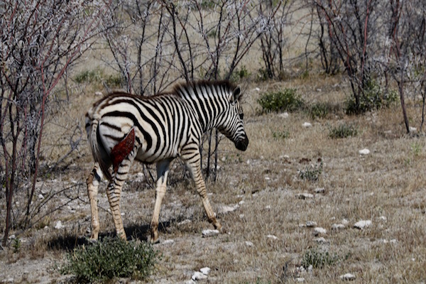 Permanecimos un rato observando a esta manada, reanudamos el camino y nuestros ojos vieron a una cebra herida, tenía un zarpazo en su pata trasera. Helder, nos dijo; que creía que había sido atacada por una hiena, y que próximamente este animal sería atacado nuevamente por algún depredador, acabando con su vida. Es cierto que daba mucha pena verla en la situación en que se encontraba, pero la vida de supervivencia y alimentación en la sabana es así.