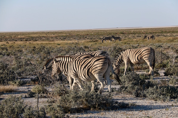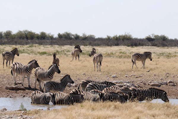 Seguimos en busca de animales y nuevamente vimos más avestruces, oryx junto a gacelas saltarinas o springbok, continuamos y nuevamente llegamos hasta otra laguna, aquí estaba ocupada por un grupo de cebras.