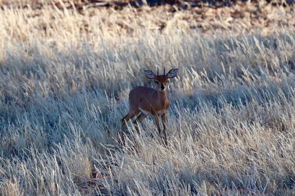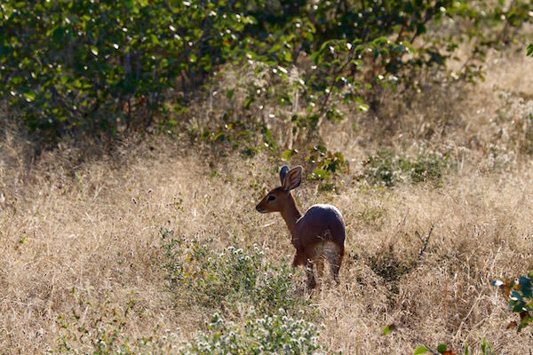A escasos metros vimos a un madoqua de kirk es un mamífero perteneciente a la especie de artiodáctilo bóvido. Tiene grandes ojos, orejas siempre tiesas, de pelaje marrón, patas delgadas, cola corta, no tiene cuernos, posee una cresta de pelo en la frente. Es uno de los antílopes más pequeños que hay, tiene 70 cm de longitud.