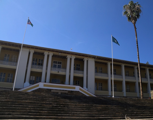 Contemplamos desde el exterior el edificio de Tintenpalast “Palacio de Tinta” su nombre se debe a toda la cantidad de tinta que se gastó en el papeleo burocrático para su construcción. Fue edificado entre 1912 y 1913, diseñado por el arquitecto alemán Gottlieb Dedecker. Al principio fue un edificio administrativo del gobierno alemán, porque en aquella época Namibia era una colonia alemana. Actualmente, es donde están las dos Cámaras Legislativas de Namibia, la Asamblea General y el Consejo Nacional. La dirección es Love Street.