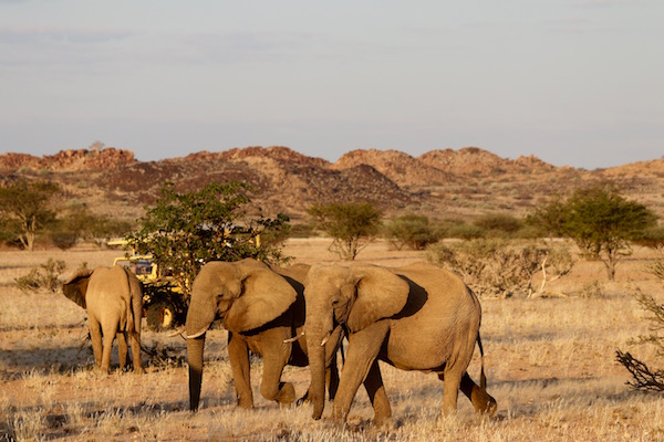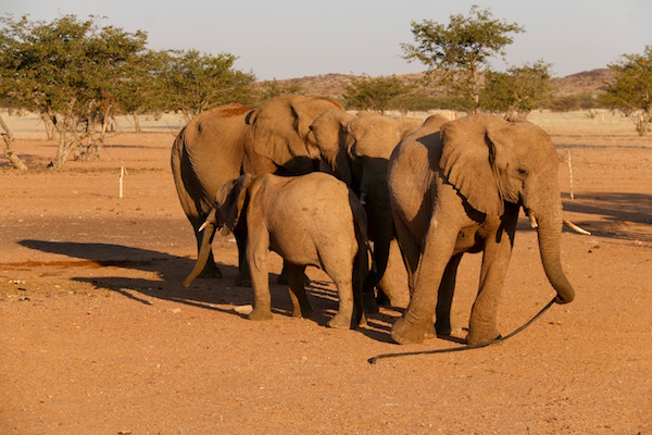 Por la tarde salimos en un vehículo 4×4, pero no era muy normal, tenía unos cuantos de años, solo contaba con una palanca marcha a adelante y hacia atrás, el motor tenía un ruido infernal. Pusimos dirección a los Bancales Secos de los Ríos de Damaraland, para ir a ver el elefante del desierto. No sabíamos si íbamos a tener la oportunidad de verlos. Es una especie de elefante africano, son capaces de sobrevivir en zonas desérticas muy extremas, soportando caminar durante días sin ingerir agua y caminando al día hasta unos 70 km. Llegan momentos en los que se ponen muy agresivos y violentos por la necesidad de beber. Nosotros os podemos decir que es cierto, vimos como llegó una manada a un poblado y les destrozo el corral donde estaban las cabras, los pobres tuvieron que salir corriendo, fue verdaderamente violento. Nuestro vehículo tuvo que buscar una zona segura, porque incluso podíamos ser atacados. Vimos como un hombre del poblado mando a un varón para que avisara al siguiente poblado, de que los elefantes estaban por la zona.
