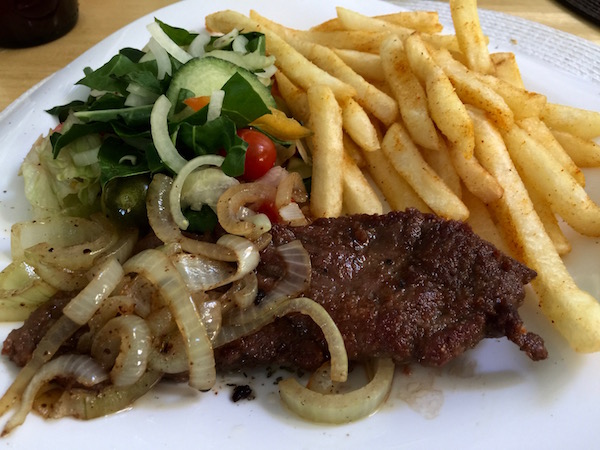 Aprovechamos para hacer uso del baño público, tuvimos que pagar 2 dólares namibios (0,13 € aprox.) Retomamos la carretera hasta llegar al Resort Toshari Lodge donde pasaríamos dos noches. A nuestra llegada nos dieron un cóctel de té verde, e hicimos el check-in, nos asignaron una villa, dejamos el equipaje y fuimos hasta el comedor para almorzar. Esta comida no la teníamos incluida. Pedimos un plato para cada uno de carne de impalas, acompañado de verduras y patatas fritas, de bebida una botella de agua mineral y postre dos cafés con leche. Pagamos un total de 240 dólares namibios (14,95 € aproximadamente).
