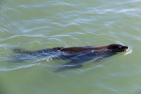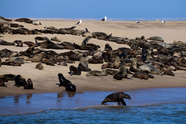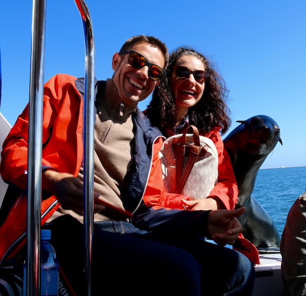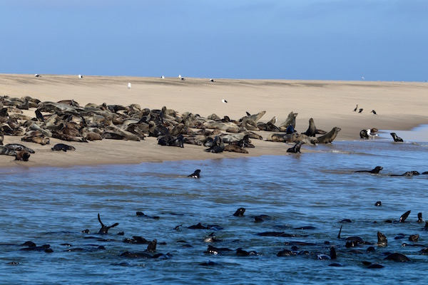 Nos acercamos hasta el Pelican Point, con su faro de la señal, donde vimos una gran colonial de focas marinas tomando el sol, bañándose en las aguas, etc. Vimos aves marinas, colonia de leones marinos, la gaviotakelp y la de Hartlaub, pelicanos, el cabo Cormorán, pasamos por donde había buques y plataformas petrolíferas, etc. Hasta se nos coló en nuestra fotografía un león marino.
