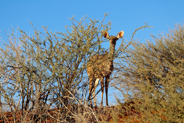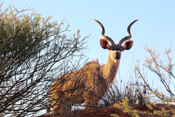 Al fin pudimos contemplar el gran kúdu, lo vimos camuflado entre los matorrales. Es un enorme antílope africano, este mamífero pertenece a la subfamilia bovina, habita en la sábana del sur y este de África. Este animal está en peligro de extinción debido a la caza deportiva por sus cuernos. Tiene una cornamenta enrevesada, solo la poseen los machos, la altura que puede alcanzar es entre 135 y 150 cm. Puede pesar hasta 300 kg, se alimenta de hierbas frescas, tubérculos, y brotes. Sus depredadores son los leones, leopardos y licaones. Pudiendo saltar hasta 2 metros. El macho suele ser solitario. El pelaje es de color beige, en el lomo tiene unas rayas blancas y en sus costados cuenta con unas manchas blancas en cara y patas. Los machos viven en solitario, únicamente se unen a los grupos en los meses de reproducción, de diciembre a febrero.