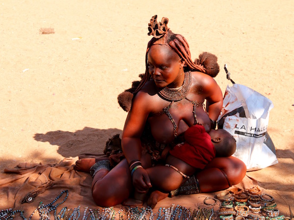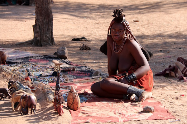 Cuando nosotros lo visitamos había dos matrimonios de ingleses en el lugar, y una chica de la tribu creo mucha amistad con una de las mujeres y le pidió a cambio de una pulsera que le diera el sujetador que llevaba puesto, la inglesa no dudo e hizo el trueque. La chica se lo colocó y volvió al puesto para ver lo que podía vender de bisutería. Aquí os dejamos una fotografía de la chica himba con el sujetador, hay que decir que le quedaba un poco pequeño, pero estaba más contenta. Yo, Elisabeth, también participe en el trueque con otra chica, les llamó la atención mi barra de labios roja, pues nada se las regale. Lo pasamos genial, nos tomamos algunas fotografías con ellos, eso si había que mostrárselas, les encantaba verse en la pantalla de la cámara, e intercambiamos palabras. ¡Recuerda!, no llevar ropa de color blanco o colores claros, los niños se acerarán y la pintura que llevan untada puede machar tú ropa.