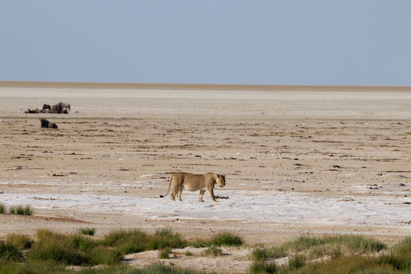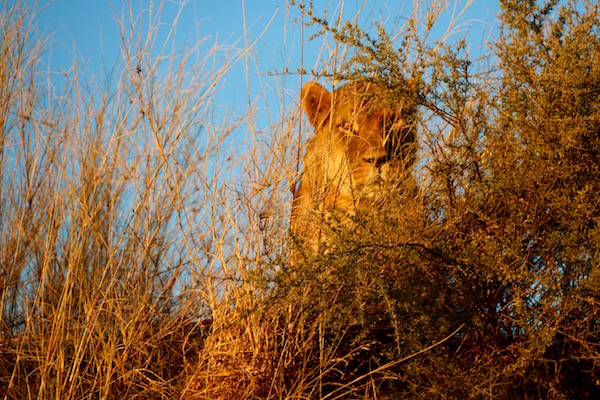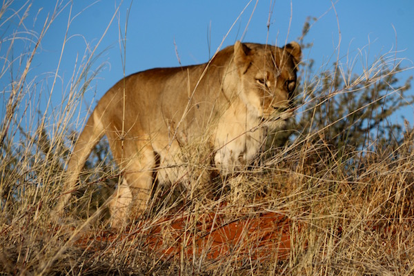 Fuimos a visitar a una leona, esta parte del safari tanto a Sergio como a mí, no nos gustó para nada, está encerrada en un campo electrificado de 1.000 hectáreas. Vive solitaria, hace unos años viva con un león, pero hace unos años él murió. Este animal es bastante mayor, no caza, le suministran la comida que necesita al día. Estuvimos unos minutos por la zona hasta localizarla, le tomamos unas fotografías y salimos del lugar.