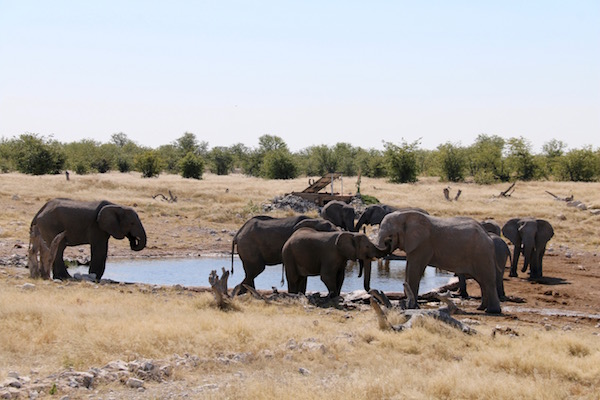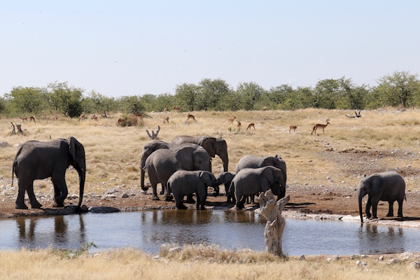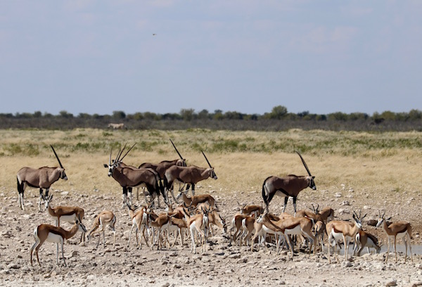 Acabamos la comida, retomamos el vehículo, para irnos a hacer un safari por el Parque Nacional de Etosha tiene una superficie de 22.270 km². Es la segunda reserva de animales más grande de África, justo detrás de Serengeti en Tanzania. Formado por dos ecosistemas, la sabana y las depresiones o lagunas saladas. Cuenta con cuatro puertas de entrada, las dos entradas más principales son la puerta al este Lindquist y la puerta al sur Anderson. En él habitan una gran cantidad de mamíferos, aves, reptiles y anfibios; como leones, rinocerontes, elefantes, búfalos, gacelas springbok, ñus, kudus, chacales, avestruces, perro salvaje, y como no el animal emblemático del país los oryx. En él hay varias charcas tanto naturales como creadas artificialmente, desde donde podremos observar a los animales que van en busca de agua. Es conocido el parque por la gran cantidad de carbonato que conforma el salar o pan principal. Se puede apreciar en muchas partes del parque. Este fue nombrado en 1907 por el gobierno de aquella época como la primera zona de conservación de Namibia. También en el lugar hay la oportunidad de alojarse en uno de los campamentos, el Okaukuejo, el Halali, el Namutoni y si quieres algo más exclusivo Dolomita y Onkoshi. También hay un restaurante y tienda de recuerdos. En el mismo parque se pueden contratar para realizar un safari. Abierto a partir del amanecer hasta el atardecer. Las horas de apertura y cierre van cambiando a lo largo de la temporada. Hay que pagar una entrada para acceder, más otro ticket por el acceso del vehículo. Si piensas visitarlo en varios días puedes obtener un bono, te saldrá más económico que comprar una entrada por día, consultarlo en la taquilla de entrada en el parque. El ticket por 1 día para extranjeros adultos tiene un coste de 80 dólares namibios por persona (4,99 € aprox.) Para nacionales la entrada cuesta 30 dólares namibios por cada uno (1,88 € aproximadamente) menores de 16 años el acceso es gratuito. La tasa de ingreso de vehículo para menos de 10 asientos es de 10 dólares namibios (0,63 € aprox.) de 11-25 plazas en el vehículo es de 40 dólares namibios (2,50 € aprox.) y de 26-50 plazas es de 300 dólares namibios (18,68 € aprox.) En el parque las distancias son bastantes grandes, además la velocidad máxima es de 30 km/h. ¡Recuerda!, debes llevar el pasaporte o un documento de identificación para poder acceder al parque, te lo pidieran a la entrada. La página: https://etoshanationalpark.co.za