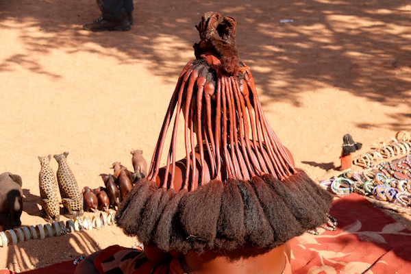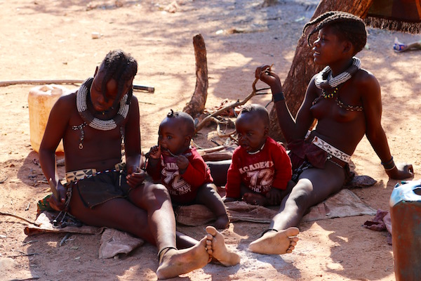 Las mujeres cuidan de los niños, del ganado, cultivan, recolectan, cocinan y confeccionan la poca ropa que utiliza. Visten con una falda corta, en la espalda llevan una capa de piel de vaca, sus senos los llevan desnudos, algo muy normal entre ellas, eso si, collares, brazaletes y pendientes, eso no falta, ¡coquetas son! En las piernas llevan unos aros metálicos, dependiendo de la cantidad que tengan, indica su estado civil; esto quiere decir que si están solteras, casadas o viudas. En su cabeza llevan largas trenzas que caen sobre sus hombros, en lo alto llevan como una especie de peineta hecha con piel de vaca, los cabellos y su piel, cada día la untan con una pintura, “otjize” es una mezcla de arcilla hecha con grasa de vaca y polvos que obtienen de unas piedras. Nos comentaron que les servían como aseo diario, para protegerse de los rayos del sol y de picaduras de insectos. No se duchan diariamente solo el día de su boda, y los días que llueve las gotas de agua que le caen, como pudimos ver, la higiene es muy escasa y los olores que sus cuerpos desprende dejan mucho que desear. Aunque se fabrican su propio perfume, no penséis que es el “Chanel 5”, se perfuman con el humo que crean al quemar las hojas de un árbol.