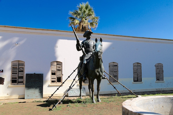 Visitamos el interior del Alte Feste edificado en 1890, fue un antiguo fuerte alemán hasta el periodo que fue tomado por Sudáfrica en 1915. Hoy en día es un museo Nacional, mostrando el pasado colonial, en el patio interior del Alte Feste, pudimos ver el monumento “Reiterdenkmal” estatua que representa a un caballero alemán de la época colonial. Creado en Berlin y transportado en barco hasta Namibia en el año 1911. Antes se encontraba expuesta frente al Alte Feste, fue remplazado por la estatua del presidente fundador, siendo en 2013 retirado y colocado donde hoy la podemos ver.