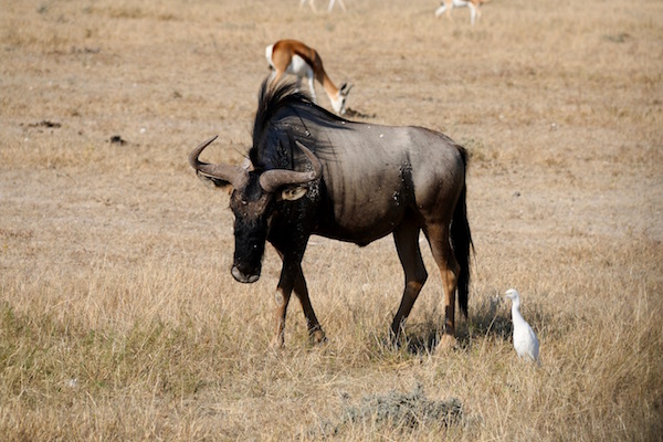 Observamos como se estaban desplazando una manada de ñus pertenecen a la familia de bóvidos, tienen cuernos lisos, afilados, curvados, tanto machos como hembras. Tienen el pelaje gris, su rostro es barbudo, el hocico es ancho. Un adulto llega alcanzar una medida entre 1,10 a 1,50 metros de altura y pesar entre 180 y 250 kg. Son animales migratorios, participan cada año en la gran emigración entre mayo y junio, desplazándose de las zonas secas hacia el norte de África. Son herbívoros, se alimentan de pasto, hierba, etc. Tienen un periodo de gestación de 250-260 días. Sus grandes depredadores son leones, leopardos, hienas y los cocodrilos cuando cruzan ríos.