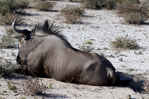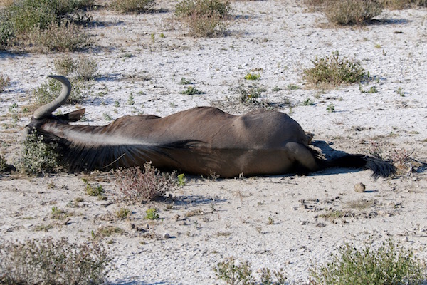 A unos metros más adelante estaba un ñu tumbado, creíamos que estaba descansando, pero Helder, nos comentó que tenía la enfermedad de la fiebre catarral maligna, que en unas horas o como mucho en un día moriría.