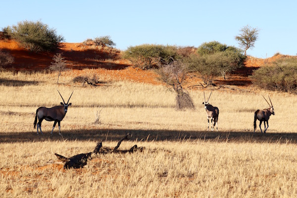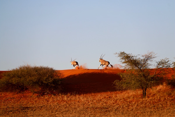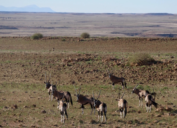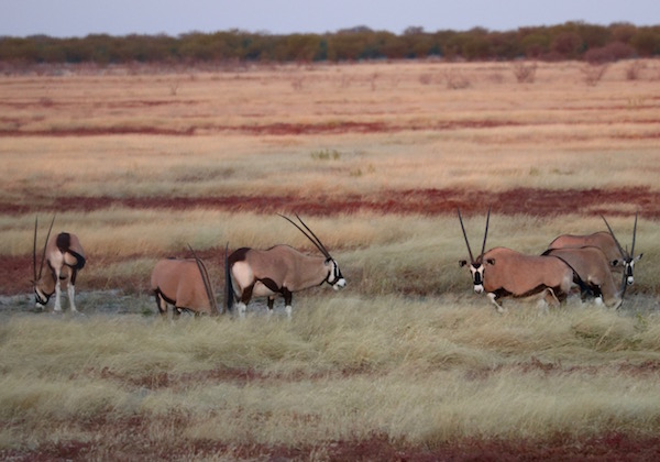 Al fin vimos a los oryx el animal emblema del país, es un mamífero de la familia de los bóvidos, son herbívoros y se alimentan de hojas, hiervas, etc., es un antílope de grandes dimensiones, pueden tener una longitud de hasta 2 metros más de 0,40 cm de cola, pudiendo pesar hasta 200 kg. Estos tienen una cornamenta de mayor tamaño con una longitud de 1 metro, algo curioso es que las hembras son un poco más grandes, se defienden de los ataques de sus depredadores con sus cuernos. El periodo de gestación suele durar unos 240 días, teniendo una única cría por parto.