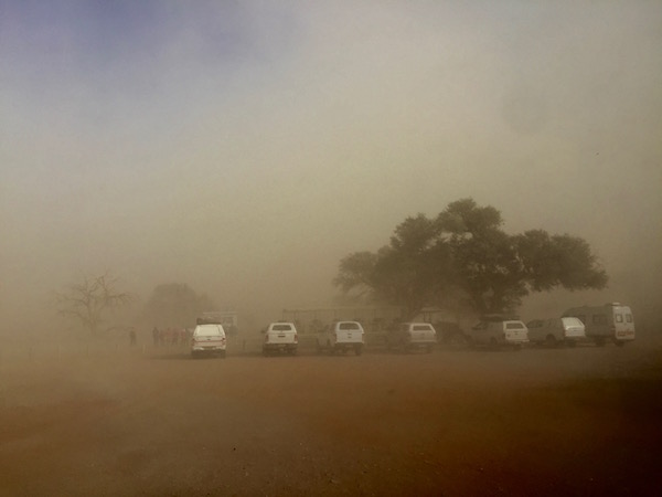 Continuamos, pasamos por la Duna 45, decidimos pasar de largo y dedicarle el tiempo a la vuelta. Había demasiada gente en el lugar para nuestro gustó. Seguimos el camino, el día nos estaba cambiando por completo, comenzó una terrible tormenta de arena, era imposible bajarse del vehículo, el viento no nos dejaba mantenernos en pie, la arena nos entraba por los oídos, ojos, y nariz. Helder se bajó y comprobó que habían cerrado el acceso a Dead Vlei, se traduce como lago muerto, situado en la reserva del Parque Namib Naukluft, rodeado de dunas muy altas, en este lugar existió un lago, hace millones de años se produjo una lluvia torrencial y creció vegetación, más tarde con el paso del tiempo el clima cambió y el lugar se volvió extremadamente seco. Los árboles (acacias milenarias) por la falta de agua han muerto, al no haber humedad no se pueden descomponer y pasaron a ser petrificados, pocas veces se producen lluvias en él. Nos quedamos sin ver las acacias milenarias con sus troncos negros, el suelo blanco de fondo rodeado de dunas de color rojizo y el azul intenso del cielo. ¡Ese paisaje que tantas veces hemos soñado con visitar!, se nos desvanecía la visita, tantos kilómetros hechos para llegar a la zona ¡Mirad con lo que nos encontramos! En fin, la madre naturaleza es muy caprichosa. El Desierto de Namibia, es el desierto más antiguo del planeta.