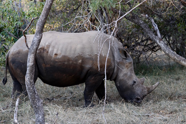 Retomamos la actividad, pasó al lado nuestra un 4×4 que avisó a nuestro guía Helder, que había a unos metros de nosotros la presencia de un rinoceronte. ¡Qué emoción!, cambiamos el rumbo para ir en busca del animal. El rinoceronte hay cinco especies en el mundo, aunque cada vez quedan menos, por dos motivos, uno es porque aún se sigue cazando por el valor de su cuerno para vender en el mercado negro, aunque está prohibido y cuando se pillan a los cazadores se les imponen grandes multas hasta cárcel, pero desgraciadamente se sigue practicando y porque el ser humano está destruyendo su entorno. Son herbívoros, se alimentan al amanecer y al atardecer, bebe diariamente agua, permanece cerca de donde hay agua, no puede pasar más de cinco días sin beber, puede provocarle la muerte. Son de gran tamaño, un adulto puede llegar a pesar 1 tonelada. Es un animal que no tiene depredadores, pero tiene al ser humano, que no sabemos nosotros qué es peor. El promedio de vida es de 60 años. No tiene muy buena visión, llamativo por el cuerno que tiene, dispone de dientes a los lados de la mandíbula, la piel de su cuerpo es gruesa, se la protege del sol y de picaduras de insectos poniéndose barro. La gestación tiene una duración de entre 14 a 18 meses, sus crías al nacer llegan a pesar entre 88 a 140 kg.