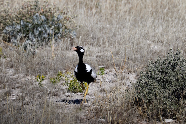 ¡Miramos al suelo!, y nos encontramos un pájaro, el sisón negro aliclaro es un ave de la familia de los sisones otididae, hay cinco subespecies. Habitan en zonas de matorrales y pastizales abiertos, en países como: Namibia, Sudáfrica, Botswana, Lesoto y Angola.