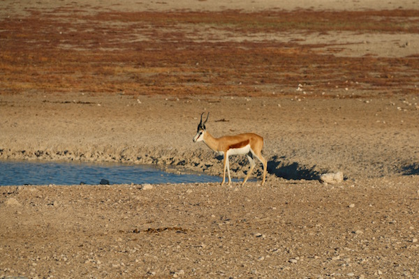 ¡Vaya mañana que llevábamos!, no queríamos ver más animales heridos o con enfermedades. Cambiamos el rumbo y llegamos a otro lago donde encontramos a una tímida gacela saltarina o springbok. ¡Recordáis!, fue la primera especie animal que nos dio la bienvenida en el Parque Nacional de Etosha, el día anterior.