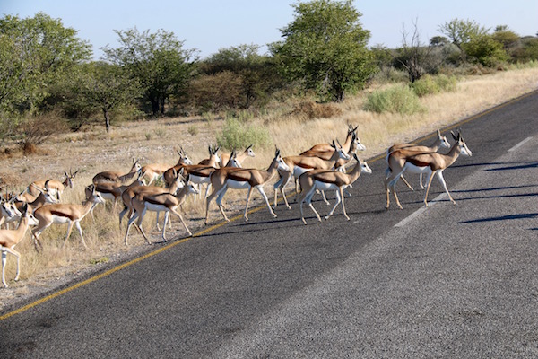 Los primeros animales que nuestros ojos pudieron ver a la entrada del parque fueron las gacelas saltarinas o springbok es un mamífero de la familia bovidae, su tamaño es medio, su altura en adulto es de 70 cm a 90 cm, los machos adultos pueden pesar de 33 a 48 kg, en cambio, las hembras pesan menos de 30 kg a 44 kg. Pueden llegar alcanzar una velocidad de 88 km/h, realiza una serie de saltos llegando alcanzar 2 metros de altura. Se dicen que son tan rápidos debido a que tienen a unos depredadores veloces, los leones, los leopardos, las hienas, los perros salvajes y las águilas. Viven en grupos de entre 30 y 100 individuos. Las hembras tienen una gestación de 168 días, dando a luz como norma general a una sola cría.