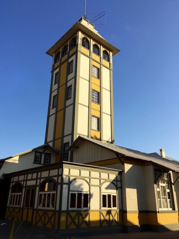 Terminada la comida, con mapa en mano nos fuimos a descubrir Swakopmund, visitamos Woermann Tower este edificio acoge una exposición de cuadros con fotografías antiguas de los edificios más importantes del lugar, algunos paneles con datos históricos y en la planta más alta se obtienen vistas panorámicas de 360º de Swakopmund, además del desierto de Namib. La cristalera de las ventanas se pueden abrir y podrás obtener mejores fotografías. El acceso se hace por un tramo de escaleras algo empinadas, hay una barandilla para sujetarse, cualquier persona con un poco de tranquilidad puede subir.