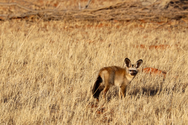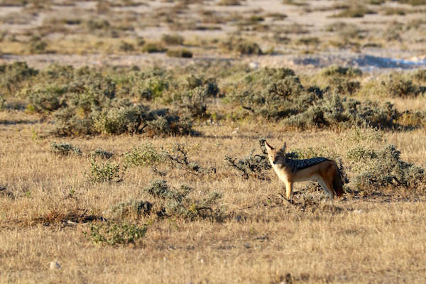 Terminada la comida, regresamos al bungalow, para descansar, ¡Buenas noches!, esperamos está noche no tener la visita de ningún elefante u otro animal. Nos despertamos con el sonido del despertador, ¡Qué bien habíamos dormido!, aunque por la zona estuvo alguna que otra gacela saltarina. La mañana estaba fresca, con una carrera para llegar al comedor y el polar, solucionamos el frío. Los desayunos, en estos días por el continente africano, nos iban a pasar factura, nos íbamos a ir con unos kilos de más, ¡estábamos comiendo demasiado! Una vez listos, a las 7:00 h de la mañana, salimos dirección nuevamente al Parque Nacional Etosha, pasaríamos el día entero en él. El mejor momento para poder ver a los animales activos, es a primera hora de la mañana y al atardecer. Nos adentramos en él, ¿Qué nos depararía el día? ¿Qué animales veríamos? Empezamos la mañana bien, viendo a un zorro, es el animal más pequeño de la familia canina. Tiene unos 70 cm de longitud, con la cola hay que sumarle entre 30 y 35 cm. Son omnívoros, nocturnos, activos durante la noche, tienen el olfato muy desarrollado. Su hocico es fino, la cabeza es ancha, orejas grandes y triangulares, el pelaje es abundante, y tiene una cola espesa. Viven en agujeros que él mismo cava en la tierra, a veces utiliza madrigueras de otros animales, acomodándolas a sus necesidades. La gestación tiene una duración de 50 días, dando a luz una camada entre 3 a 8 cachorros. Es un animal muy inteligente y ágil.