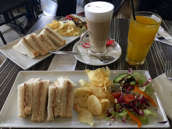 Nos paramos en la Cafetería L’Academia Café donde nos pedimos un zumo de naranja, que por cierto fue de cartón, lo vendían como natural, pero para nada era natural, un café con leche y dos sandwiches de atún, pagamos un total de 11,45 €. Situado en Freedom Square. ¡Comenzaba a llover!, la ciudad nos estaba recibiendo con gotas de agua. En unos segundos las calles se quedaron desiertas, todo el mundo abriendo paraguas y otros se adentraban en locales para resguardarse del chaparrón que estaba cayendo.