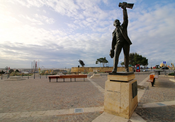 Fuimos hasta la Plaza de Castilla donde hay una escultura de Manwel Dimech, fue un escritor, periodista y reformista social maltés. La escultura está situada delante del edificio del castillo de Auberge, está fortificación fue construida en 1574 por parte de Girolamo Cassar, se vio dañada durante el asedio francés y durante la Segunda Guerra Mundial. En él se alojaron los caballeros de Castilla, León y Portugal, también fue ocupada por las tropas francesas y luego utilizado como cuartel general del Ejército Británico. En 1741 se vio reconstruido por el arquitecto Andrea Belli por los daños que presentaba. Hoy en día este inmueble solo se puede contemplar desde el exterior porque desde el 1972 es la residencia oficial del Primer Ministro de Malta. Localizado en el punto más alto de la ciudad en Triq II-Merkanti.