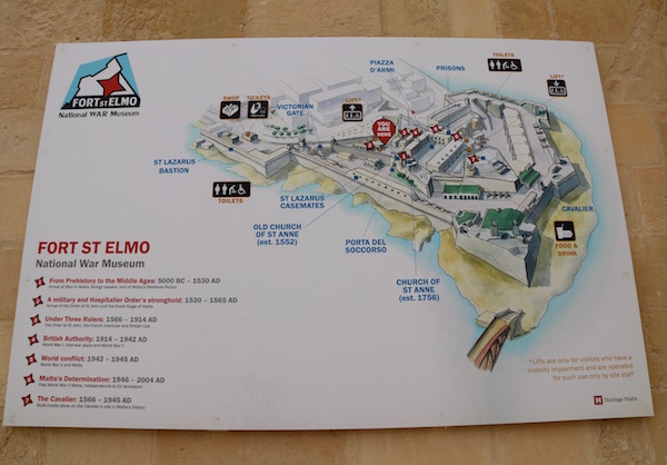 El Fuerte de San Telmo o San Elmo esta fortificación fue levantada a mediados del siglo XVI en 1552 por los caballeros de la orden de San Juan, en forma de estrella, con la función de proteger el acceso del puerto de Malta en aquella época, sobrevivió al asedio de 1565, hoy en día se conserva en muy buenas condiciones. Actualmente, es la academia de policía. Permiten las visitas del público los domingos a partir de las 11:00 h, excepto en verano desde mediado de julio hasta finales de septiembre. Accedimos a la taquilla donde mostramos nuestro abono, allí también está una pequeña tienda de recuerdos.