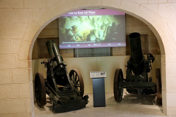 Nos adentramos en el lugar pasamos por la Puerta Victoria, vimos las casamatas de San Lazarus, subimos unos pequeños peldaños pegados a la muralla de la fortificación desde donde pudimos obtener unas vistas panorámicas del fuerte de San Angelo, del Ricasoli, Bighi, el faro de San Telmo, etc. Cruzamos la puerta del Socorro, pudimos acceder a la vieja capilla de San Anne, data del 1552, salimos del templo y subimos unas escaleras que nos llevaron a una parte de la fortificación donde se halla el museo Nacional de la Guerra, mostrando al visitante una colección de la Primera y Segunda Guerra Mundial, mediante fotografías, medallas, armas, objetos, utensilios, etc., también hay una sección dedicada a la marina real británica enseñando uniformes, insignias, instrumentos, objetos, armamento, etc. Hay un total de 7 salas, cuando nosotros visitamos la zona la sala 7 permanecía cerrada al público. En la sala 1: va desde la prehistoria hasta la edad Media, sala 2: la fortaleza de una orden militar y hospitalaria de 1530 a 1565, sala 3: bajo tres reglas 1566 a 1914, sala 4: autoridad británica de 1914 a 1942, sala 5: conflicto mundial 1942 a 1945, sala 6: determinación de Malta de 1946 a 2004, sala 7: permanecía cerrada. Tomamos unas fotografías de la Plaza de Armas, y visitamos la Iglesia de San Anne, fue edificada en 1756. La entrada al museo tiene un coste de 10 € (18 a 59 años) por cada uno, para niños, adolescentes, estudiantes y mayores de 65 años, cuesta 7,50 € por persona, niños de 6 a 11 años vale 5,50 € por cada uno, infantiles de 1 a 5 años el acceso es gratuito. El horario de visitas en invierno de lunes a domingos de 9:00 h a 17:00 h, el último pase del día a las 16:30 h, en verano todos los días desde las 9:00 h hasta las 18:00 h, siendo el último pase del día a las 17:30 h, permanece cerrado los días festivos 24, 25, 31 de diciembre, 1 de enero y Viernes Santo.
