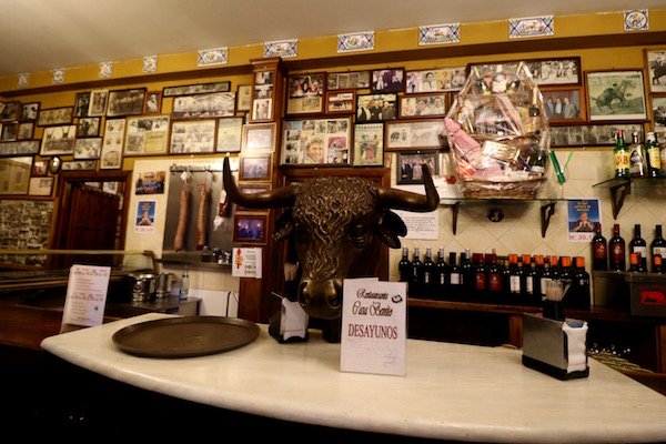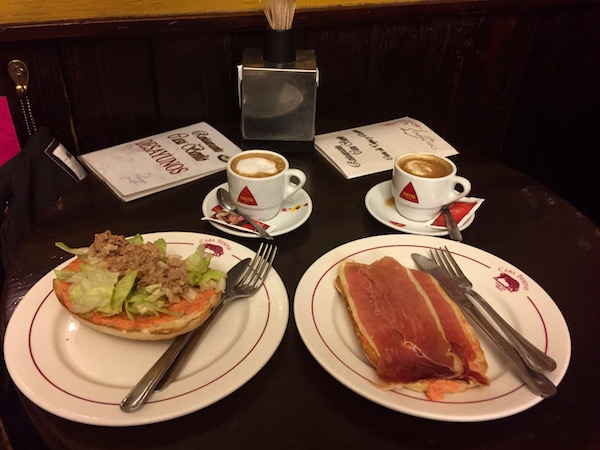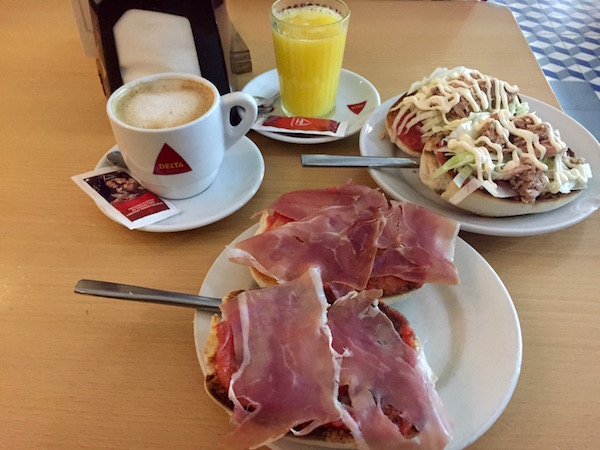 ¡No había nadie en las calles!, bueno, nosotros y algún que otro barrendero nos encontramos por el camino, pasamos por varias cafeterías y estaban cerradas, ¡al fin nos encontramos un local abierto!, el Restaurante Casa Benito, es una taberna taurina que ofrece comida española. Nos pedimos dos cafés con leche, una tostada catalana (tomate, jamón serrano) y para el otro una vegetal. Pagamos un total de 4,60 €. Situado en la Calle San Francisco nº 3.