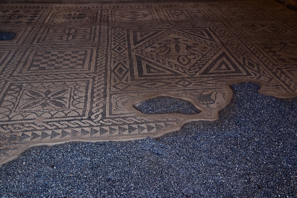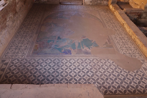 Fuimos caminando hasta nuestra siguiente visita, la Casa de Mitreo, es un inmueble romano de finales del siglo I d.C., y comienzos del siglo II d.C. localizado fuera de las murallas de Mérida. En él pudimos ver decoraciones a base de pinturas y mosaicos, siendo el mosaico más importante el llamado “Cósmico” que representa el cielo, la tierra y el mar.
