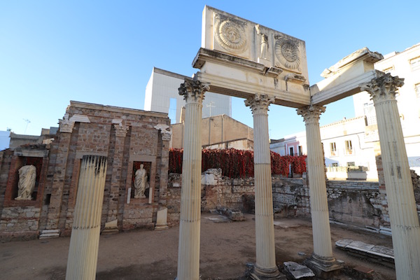 El Pórtico del Foro, levantado en el siglo I d.C. albergo diferentes edificios tanto religiosos como oficiales. Los restos que se han encontrado en él están expuestos en el museo Nacional de Arte Romano. Solo es posible verlo desde el exterior. Situado en la Calle Sagasta.