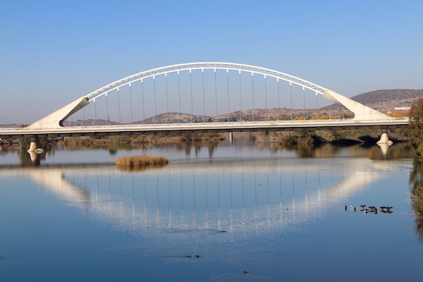 Desde el puente romano pudimos ver a lo lejos otro Puente, el de Lusitania, fue diseñado por el arquitecto Santiago Calatrava (valenciano), siendo inaugurado el 10 de diciembre de 1991, suponiendo el cierre del tráfico de vehículos al puente romano.