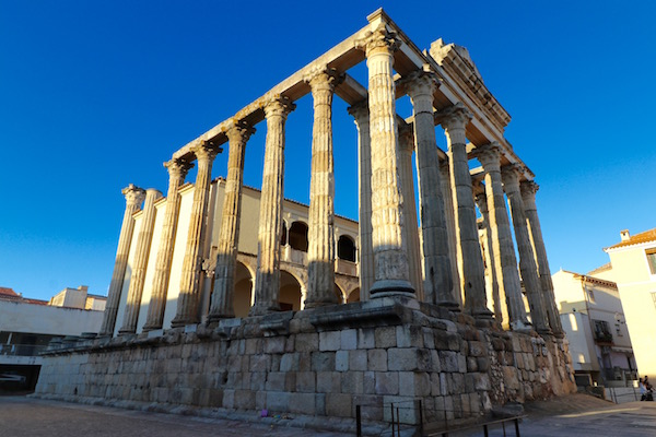 El Templo de Diana, levantado en el siglo I a.C. para su construcción se utilizó roca granítica de la zona, en planta rectangular con columnas alrededor, con 40,70 metros de largo incluyendo la escalera de acceso y 22 metros de ancho. Formo parte del foro romano de Mérida, templo dedicado al culto imperial. En el siglo XVI, se edificó en parte de su estructura un palacio de estilo renacentista, conocido como “casa de los milagros” para el conde de Corbos. Solo se puede contemplar desde el exterior. Situado en la Calle Romero Leal.