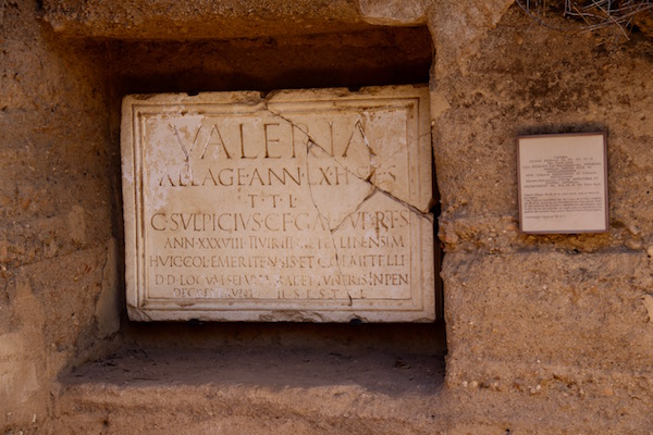 Desde la Casa de Mitreo, a través de un corredor a ambos lados flanqueado por cipreses, entramos en los Columbarios, es una área funeraria de dos tumbas de incineración a cielo abierto de dos familias romanas: los Voconios y los Julios, edificada en el siglo I d.C., pudimos ver otros edificios funerarios del siglo IV, llamados “Bodegones”o “Cueva de Lateros”, sarcófagos, urnas, estelas funerarias. También cuenta con un centro de interpretación al aire libre que muestra los ritos funerarios de la época romana, etc. Nosotros no tuvimos que pagar entrada, al llevar el ticket al circuito completo. El ticket individual por adulto cuesta 6 € por persona. El ticket reducido 3 €. ¡Recuerda!, la taquilla y el acceso se cierra a las 18:00 h. Permanece cerrado el 1 de enero, 24, 25 y 31 de diciembre. La dirección es Vía Ensanche s/n. ¡Ojo!, para acceder a él, actualmente hay que entrar por la casa de Mitreo y salir por ella.