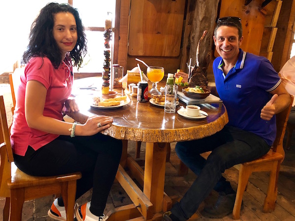 Acabada la visita, le dijimos a Ciro; que nos llevara a un buen restaurante, almorzamos en el Restaurante Ahumados Katok pedimos como entrante una sopa de verduras, de plato principal, un pincho de lomito (res) acompañado de patatas cocida, pan y para el otro fue una chuleta de res, con guarnición cebolla caramelizada y patata cocida, de bebida una coca cola y un té frío, dos cafés con leche. Pagamos un total de 753 quetzales (85,87 € aprox.) Ofrece wifi gratis y va bastante bien. Es cierto que la comida estaba muy rica, los platos tenían presentación y calidad. Ofrece comida guatemalteca y asador. El teléfono de contacto es: +50278403387. Abierto de lunes a miércoles de 5:30 h a 21:00 h, de jueves a domingo de 5:30 h a 21:00 h. La página web: http://ahumadoskatok.com Situado en la Carretera Panamericana km 87 Tecpán Guate, Chimaltenango.