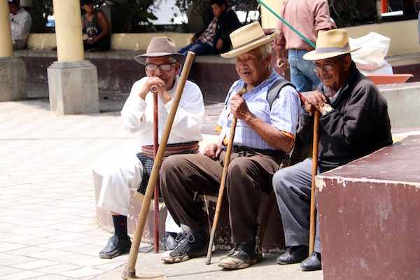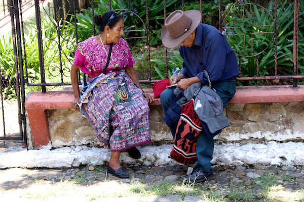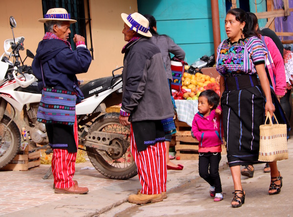Aquí las mujeres indígenas llevan faldas y huipiles (blusas) bordados de flores y aves, los hombres llevan pantalones a rayas.